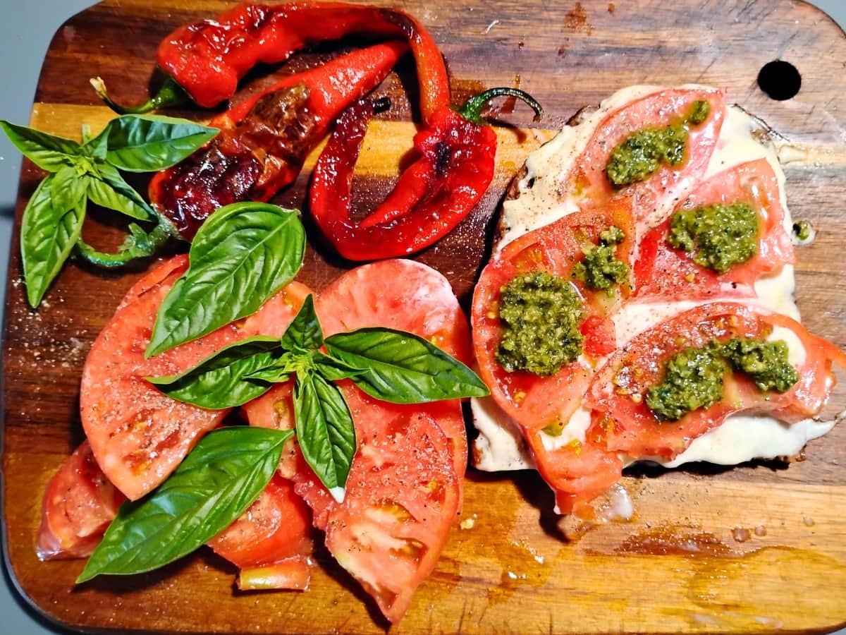A messy affair, but the best food on earth! Fried Jimmy Nardello peppers, sun-ripened Brandywine tomato on a slice of pan-fried ancient grain sourdough bread with homemade mayonnaise and pesto.